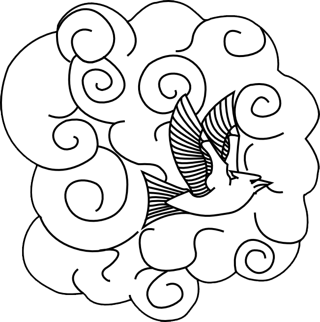 This is the one of my first attempts at creating an illustration line artwork, made in Inkscape. While most of my featured work is vector-based, this example was created more in the style of an ink drawing. The most interesting part of drawing a bird flying through a cloud was how to properly convey movement with just lines. I also had fun drawing the finer details of the bird, such as the feathers in its wings and tail. Spiral patterns are also fun to draw, so incorporated many of them into the background cloud.