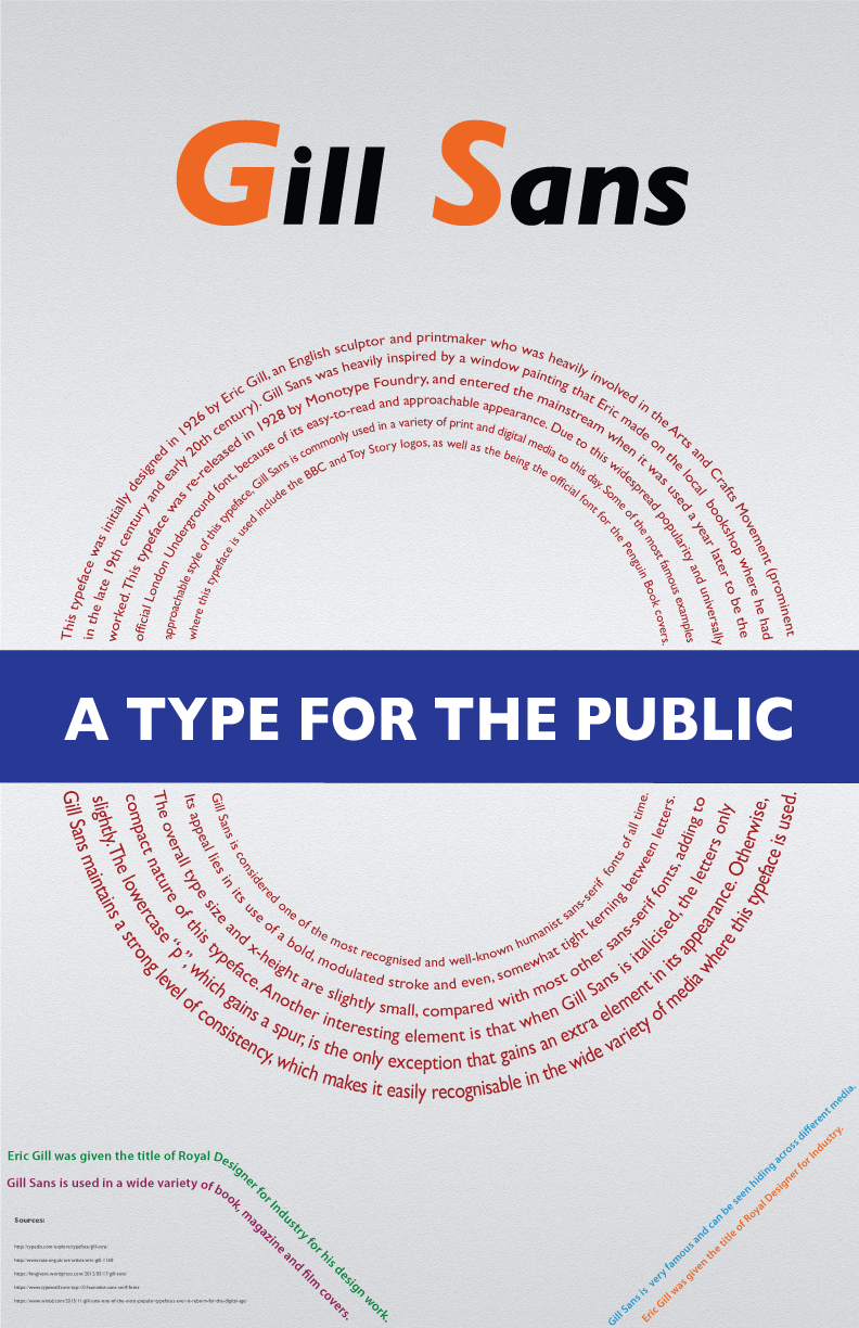 Gill Sans is a typeface that was designed in the 1920s, a decade commonly associated with novelty in style, fashion and commerce. Since this typeface is most most commonly associated with the London Underground, it can be seen as a typeface that connotes elements of speed, movement and efficiency. Gill Sans obviously takes pride in being a clear, easy-to-read and orderly typeface. Gill Sans is commonly used across various forms of media, such as logos (BBC, Toy Story) and literature (the orange-and-white Penguin book covers).