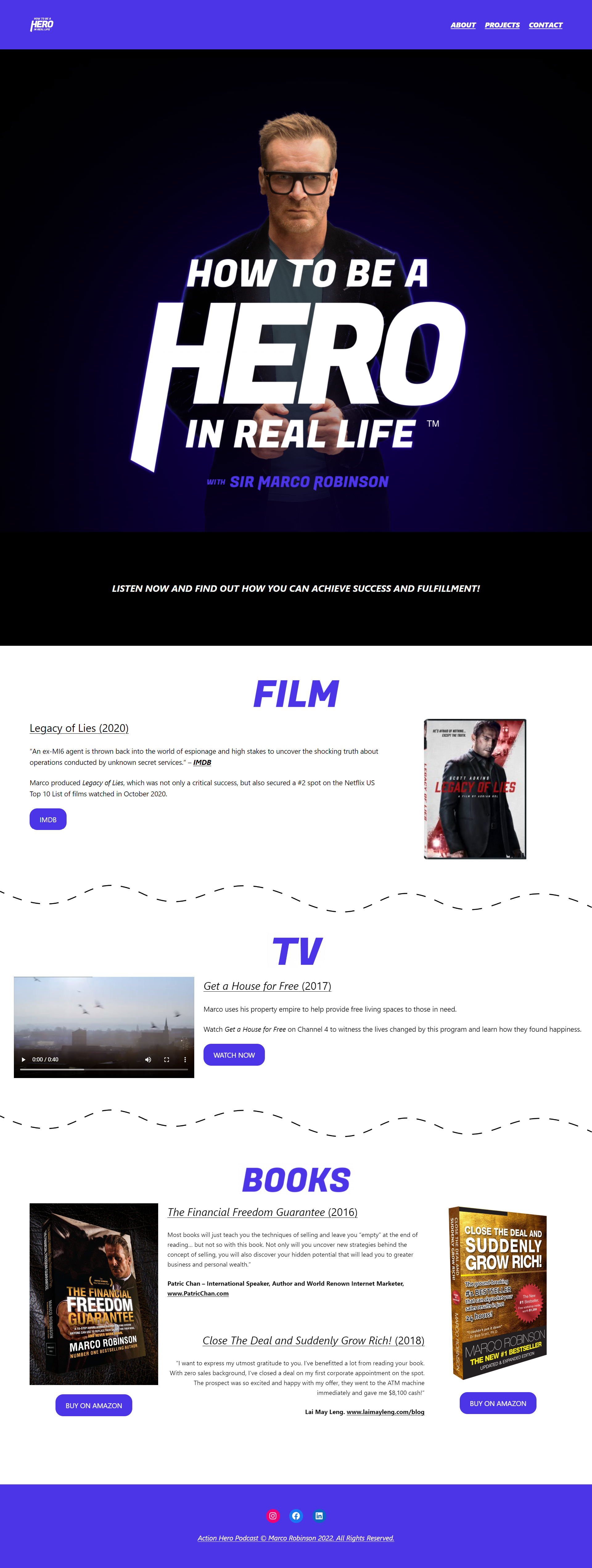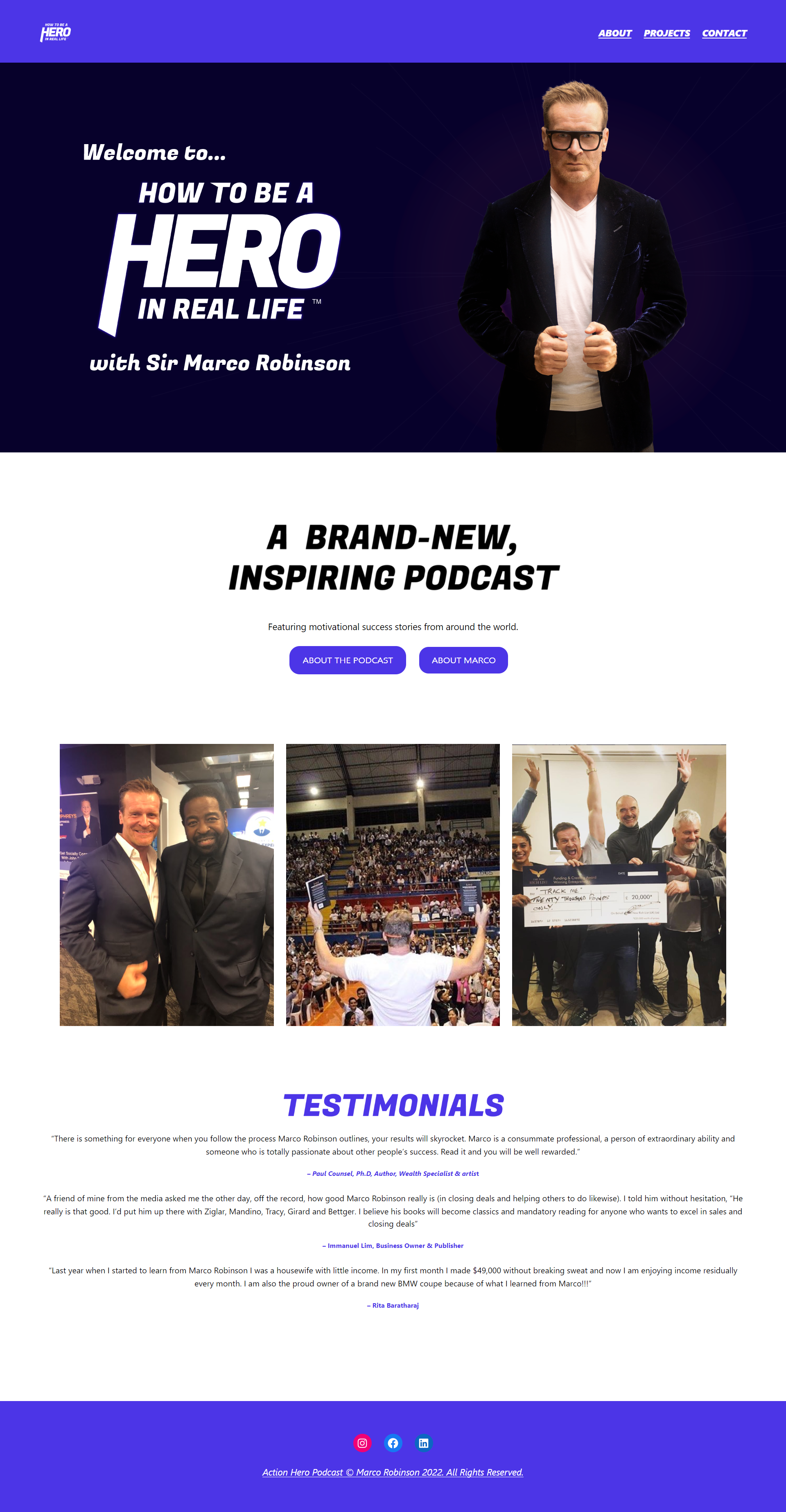 I was approached by Sir Marco Robinson for a web design brief. He commissioned me to build a website to promote his upcoming podcast How to Be a Hero in Real Life, as well as his other projects.