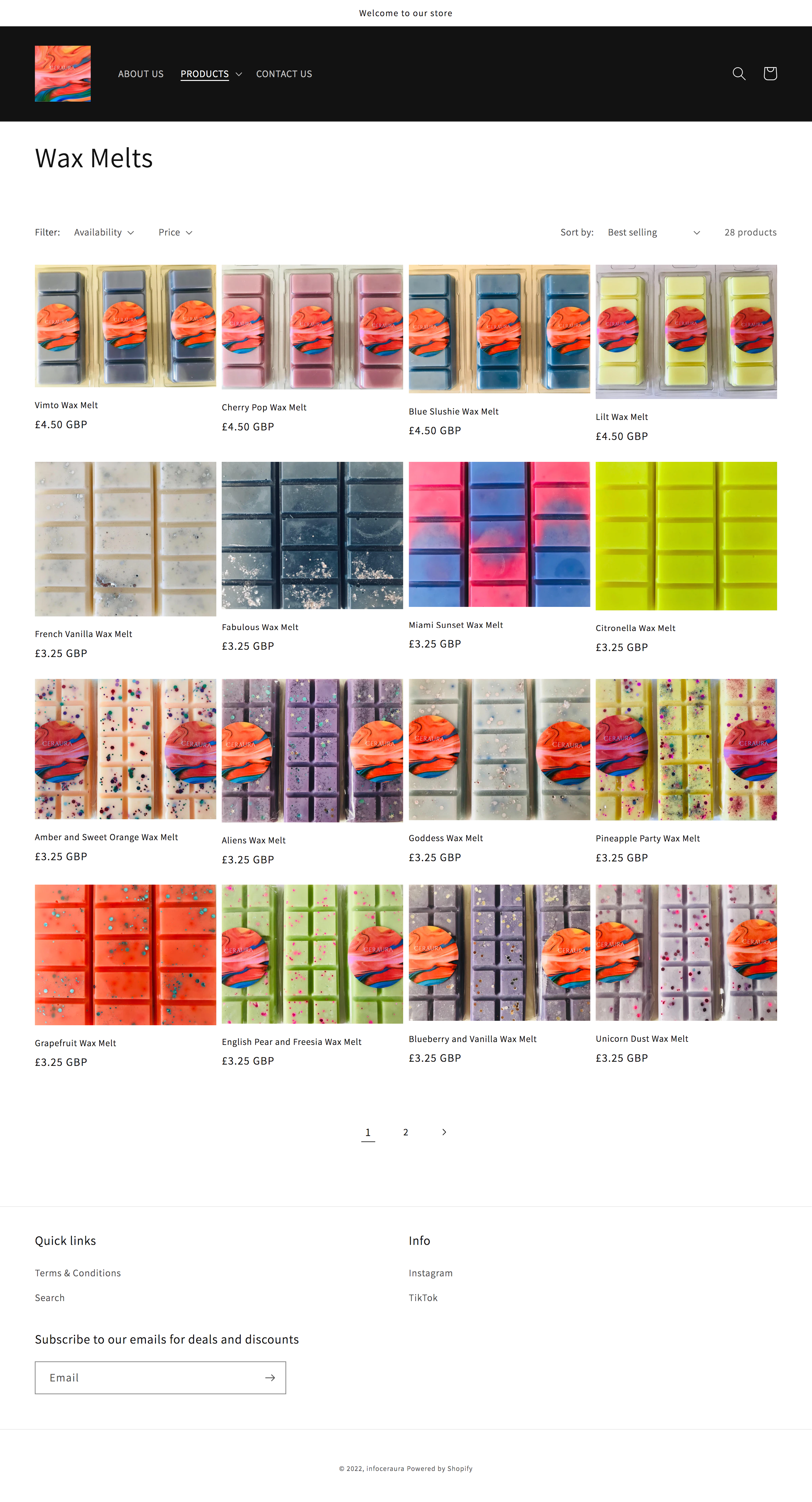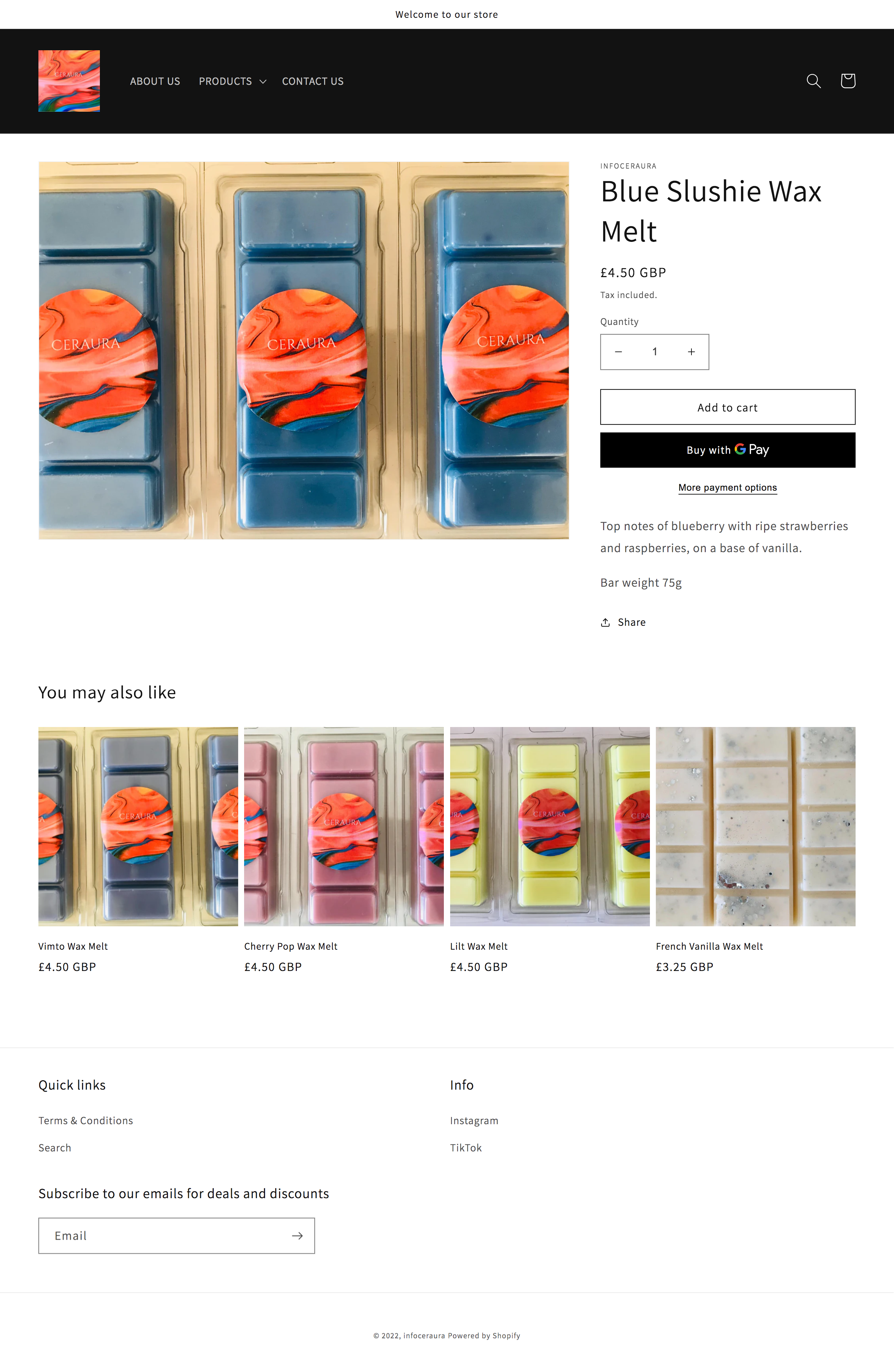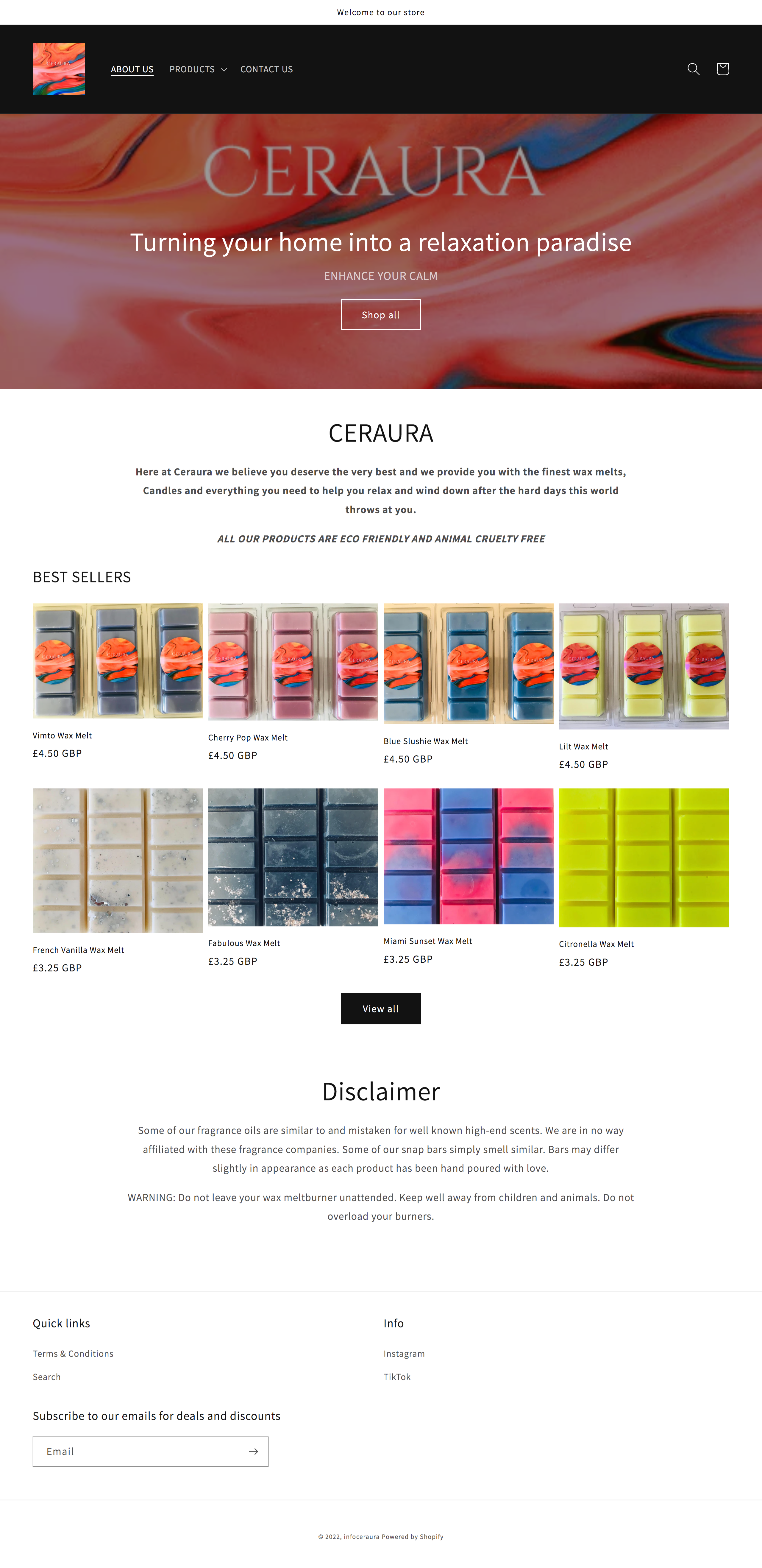 Continuing with my strengths from creating several other e-commerce sites, I was tasked with building an online shop for Ceraura. This new brand specialises in producing and selling items that help the customer relax. These products include a wide-ranging array of candles, bath bombs, soaps and wax melts.