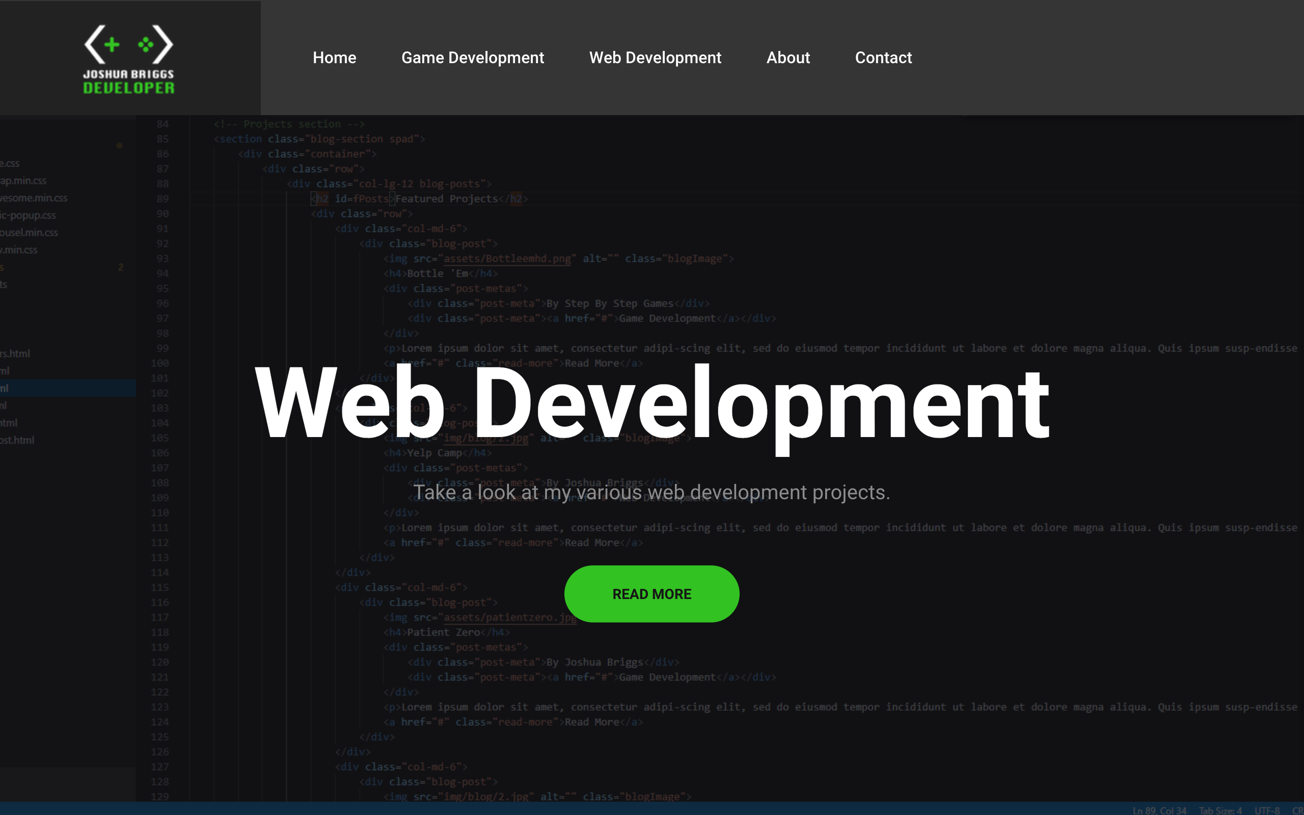 In this design, I decided to include imagery relating to the main themes of the portfolio: web and game development. To represent these two fields, I included game controller buttons inside a couple of code brackets.