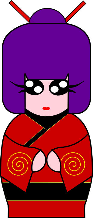 This is my rendition of a Japanese Kokeshi doll. This was made with the use of Inkscape, a free graphic design software. Originally from northern Japan, Kokeshi dolls are made from wood and head bigger than the body. The Kokeshi's face is usually defined by a few lines of paint, while the body is usually decorated with ornate, floral patterns. My design is based on this concept, while also following a simpler line and colour-based style.
