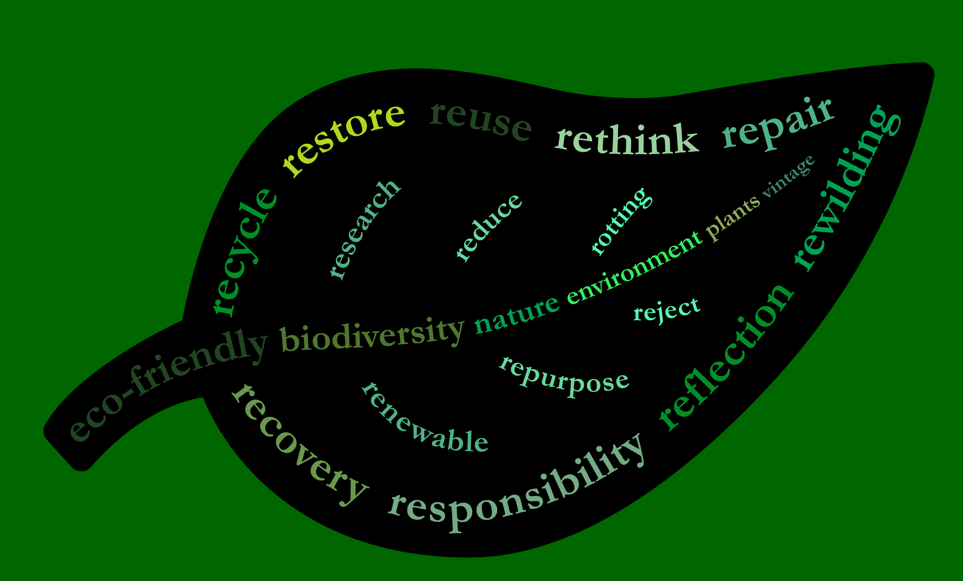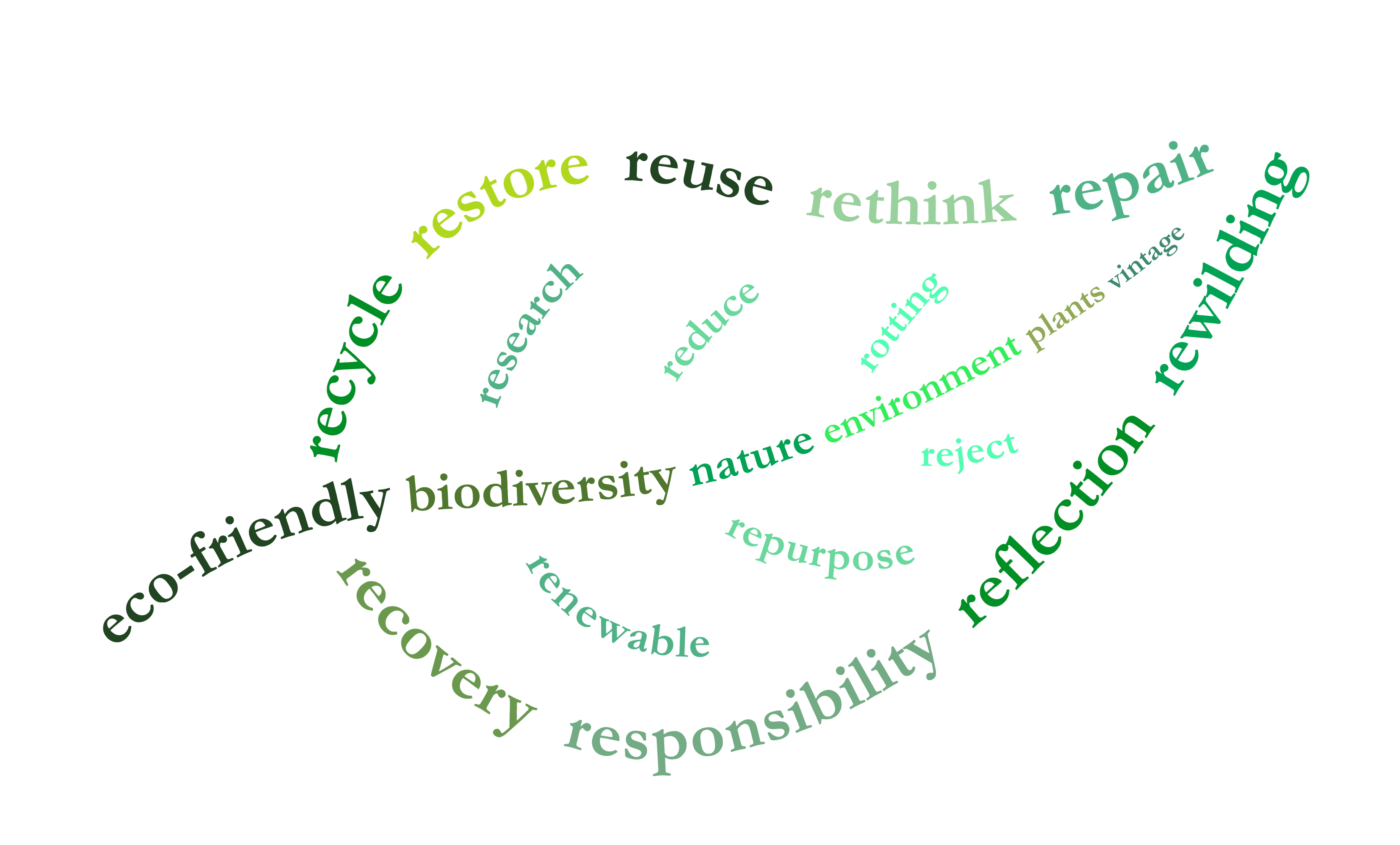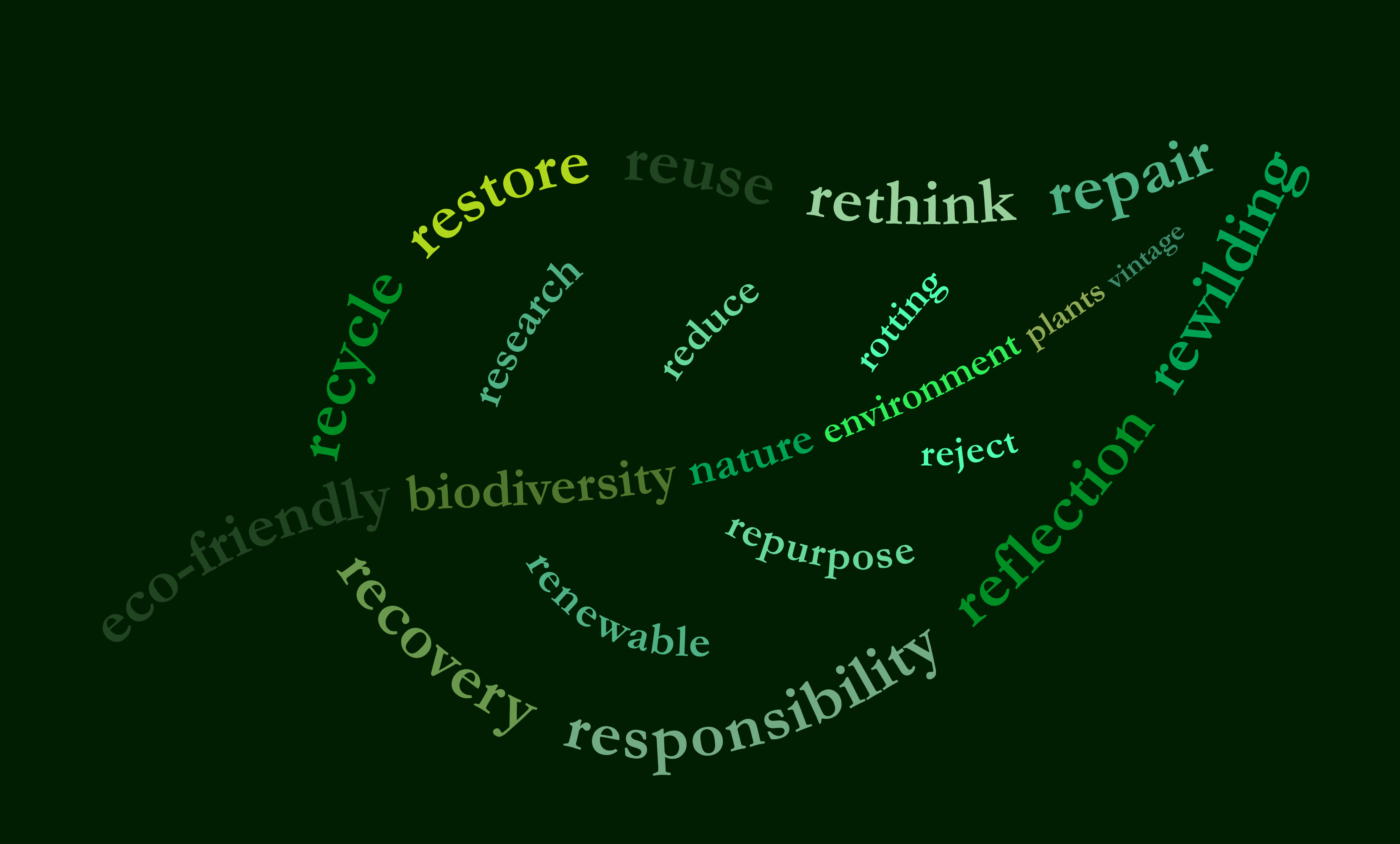 As with many of my graphic design projects, I went with Adobe Illustrator to arrange the words I collected into this shape. With the alternate design I made (see below), I wanted to experiment with placing text along paths, which is not what I usually do in my work. This particular design puts more emphasis on the many "re-" words that are linked with the environment at large. I enjoyed trying word layouts and colours linked with this key topic and I look forward to doing more!