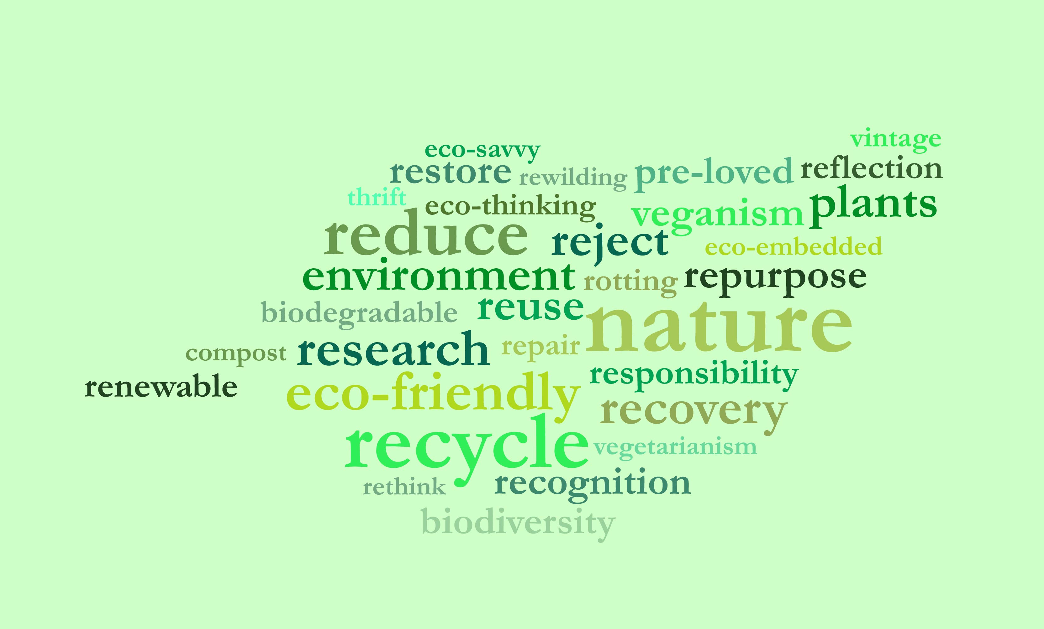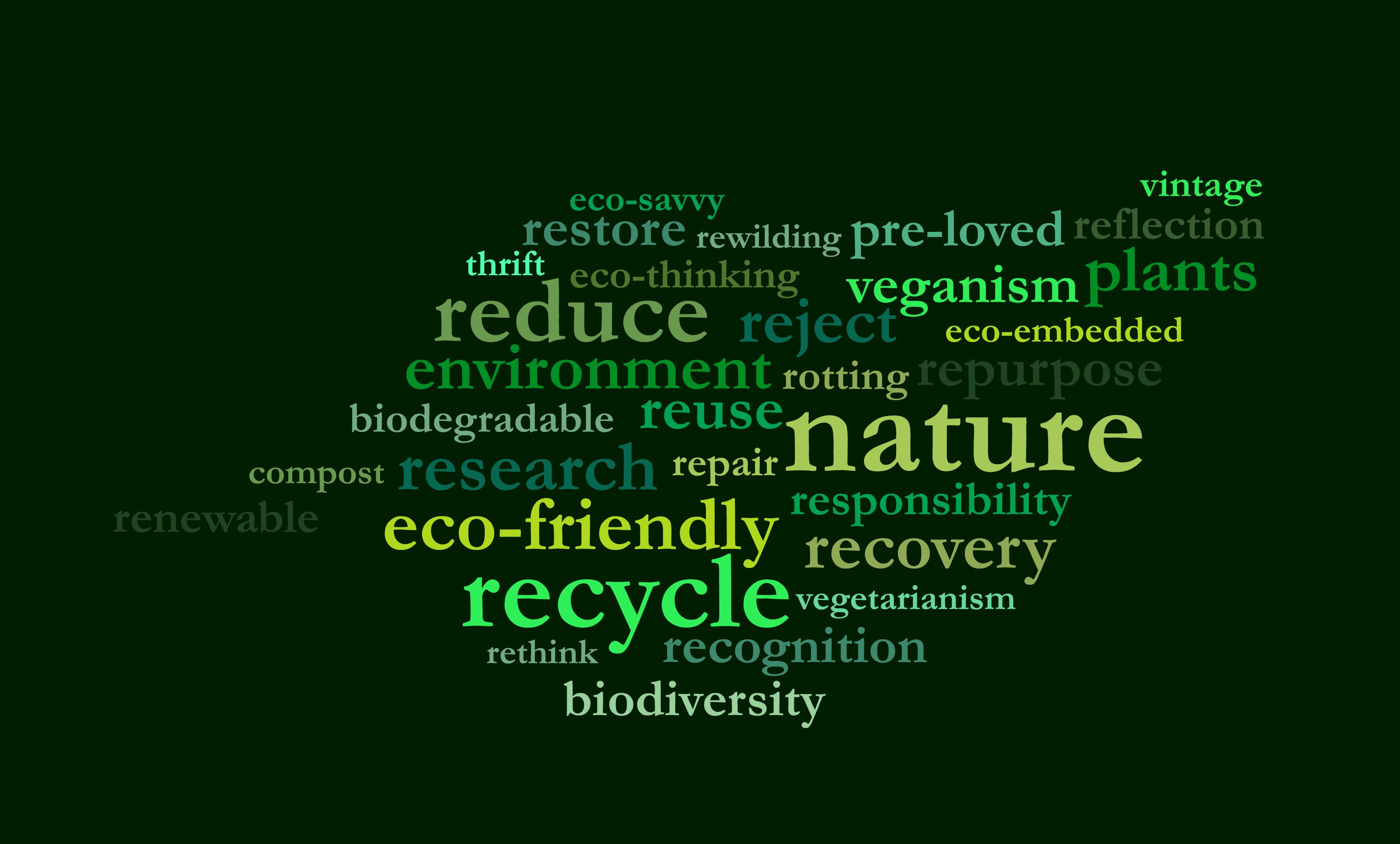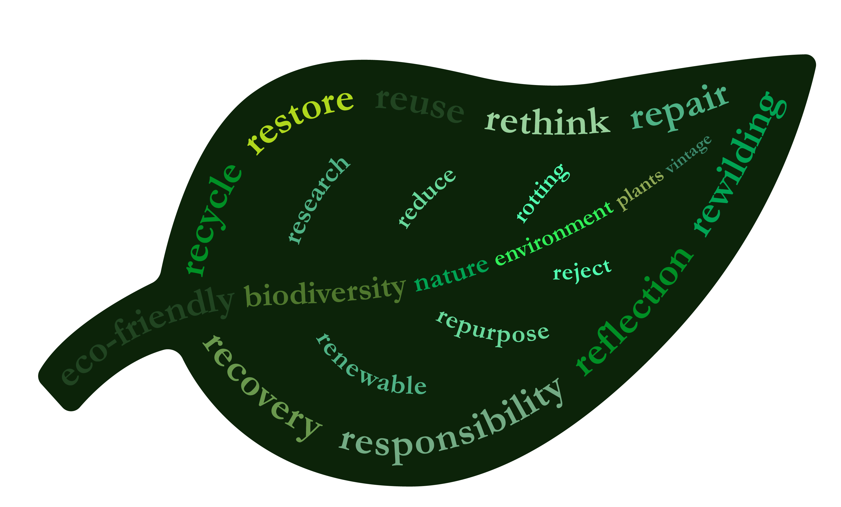 As with many of my graphic design projects, I went with Adobe Illustrator to arrange the words I collected into this shape. With the alternate design I made (see below), I wanted to experiment with placing text along paths, which is not what I usually do in my work. This particular design puts more emphasis on the many "re-" words that are linked with the environment at large. I enjoyed trying word layouts and colours linked with this key topic and I look forward to doing more!