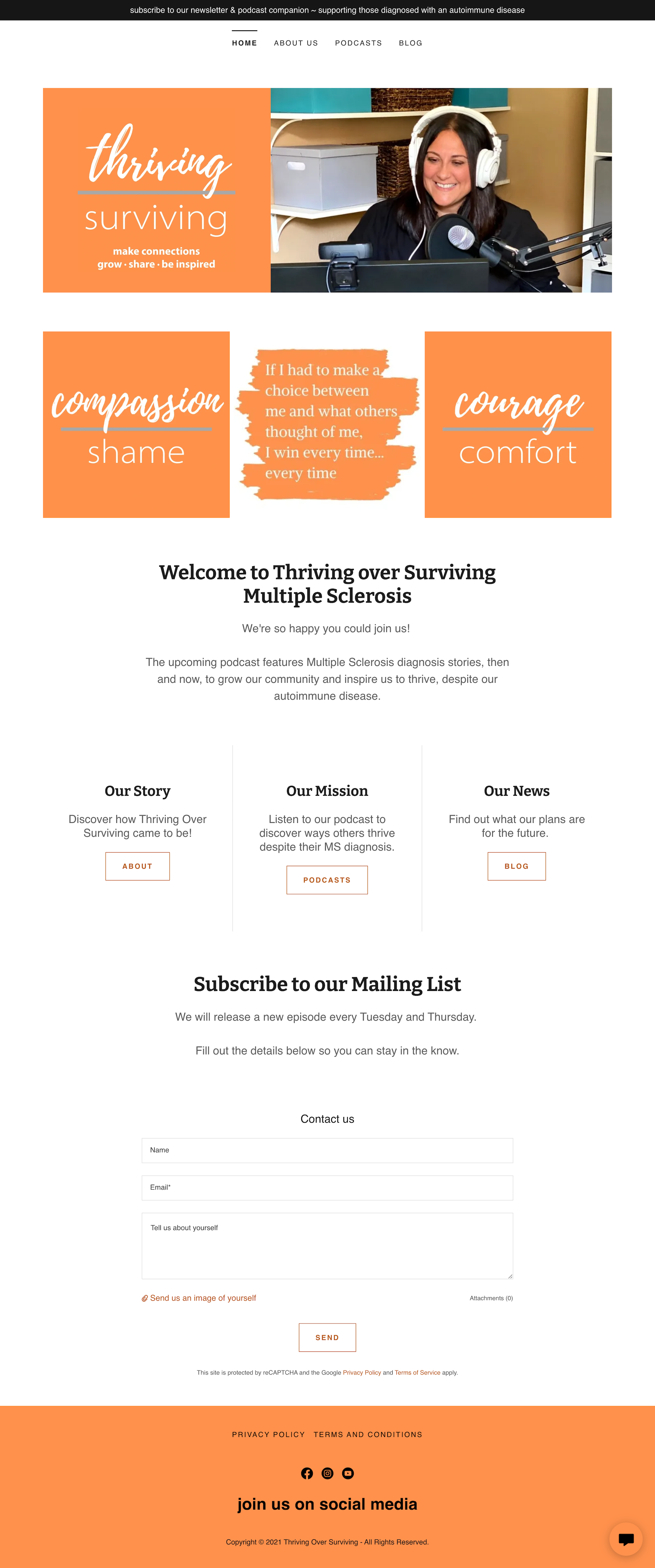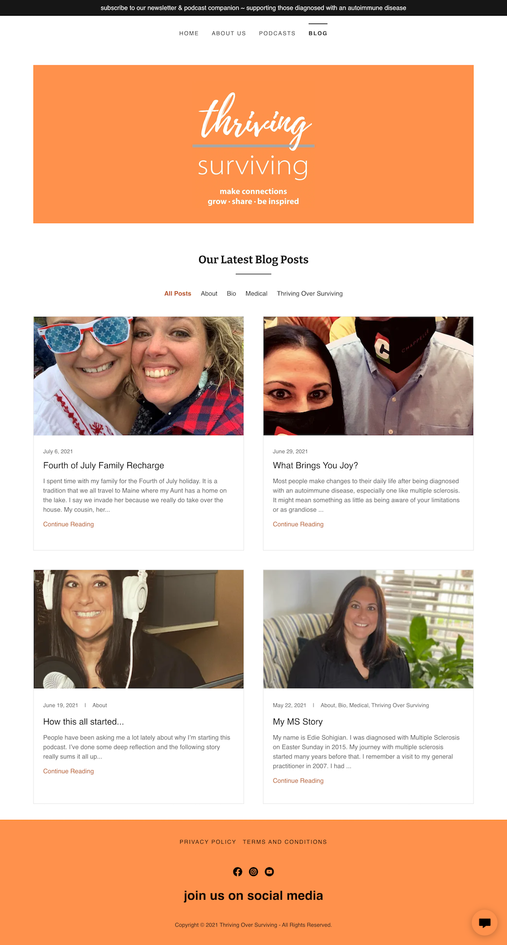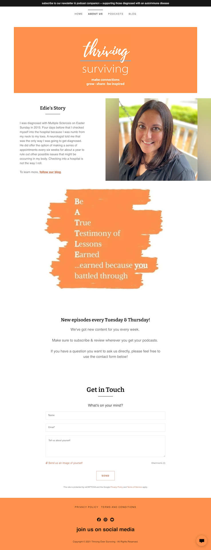 For this engaging new project, I was approached to design the website and some of the imagery for a podcast called Thriving Over Surviving. This podcast is run by Dr. Edie Sohigian and every week, she interviews new guests who have previously had experience with various autoimmune diseases and discusses how their lives have been affected as a result.