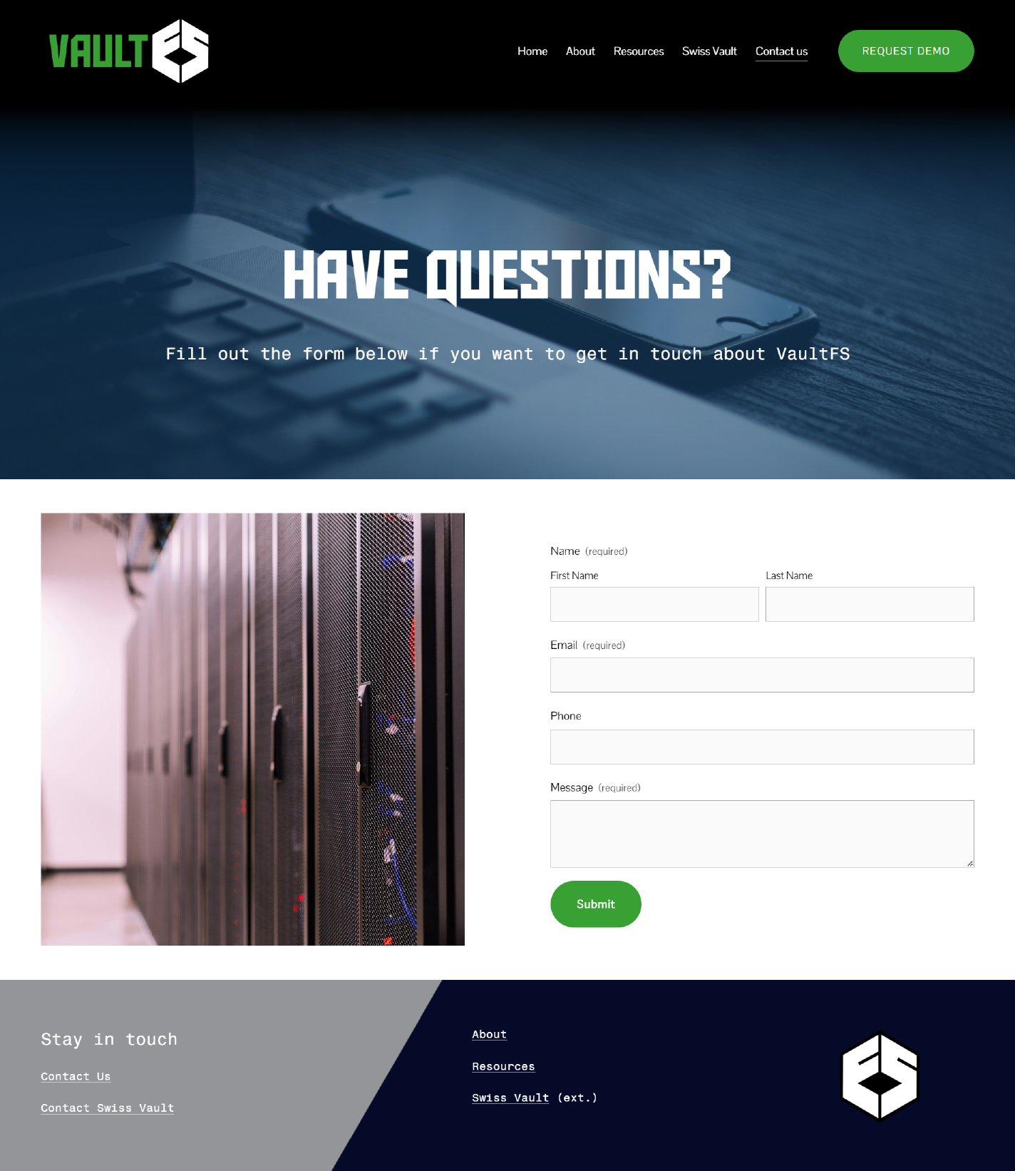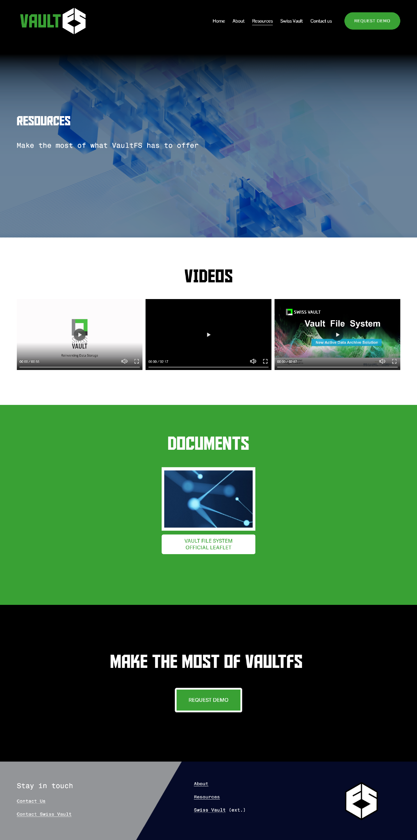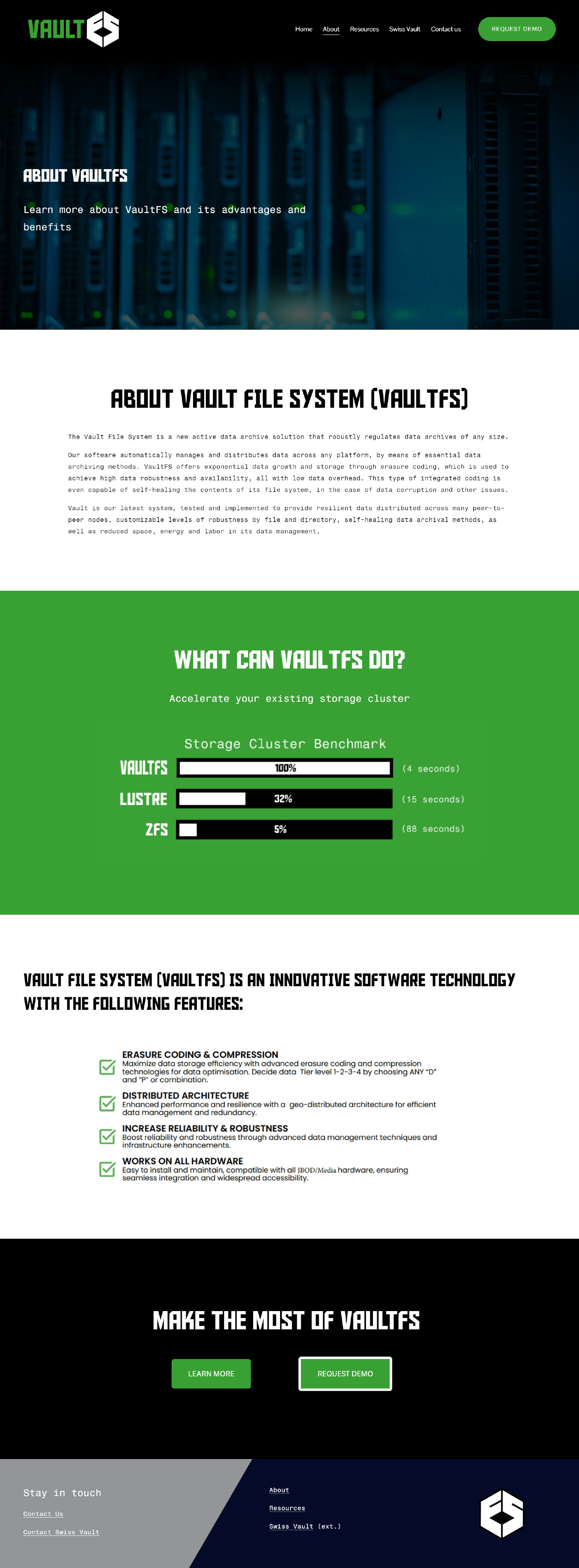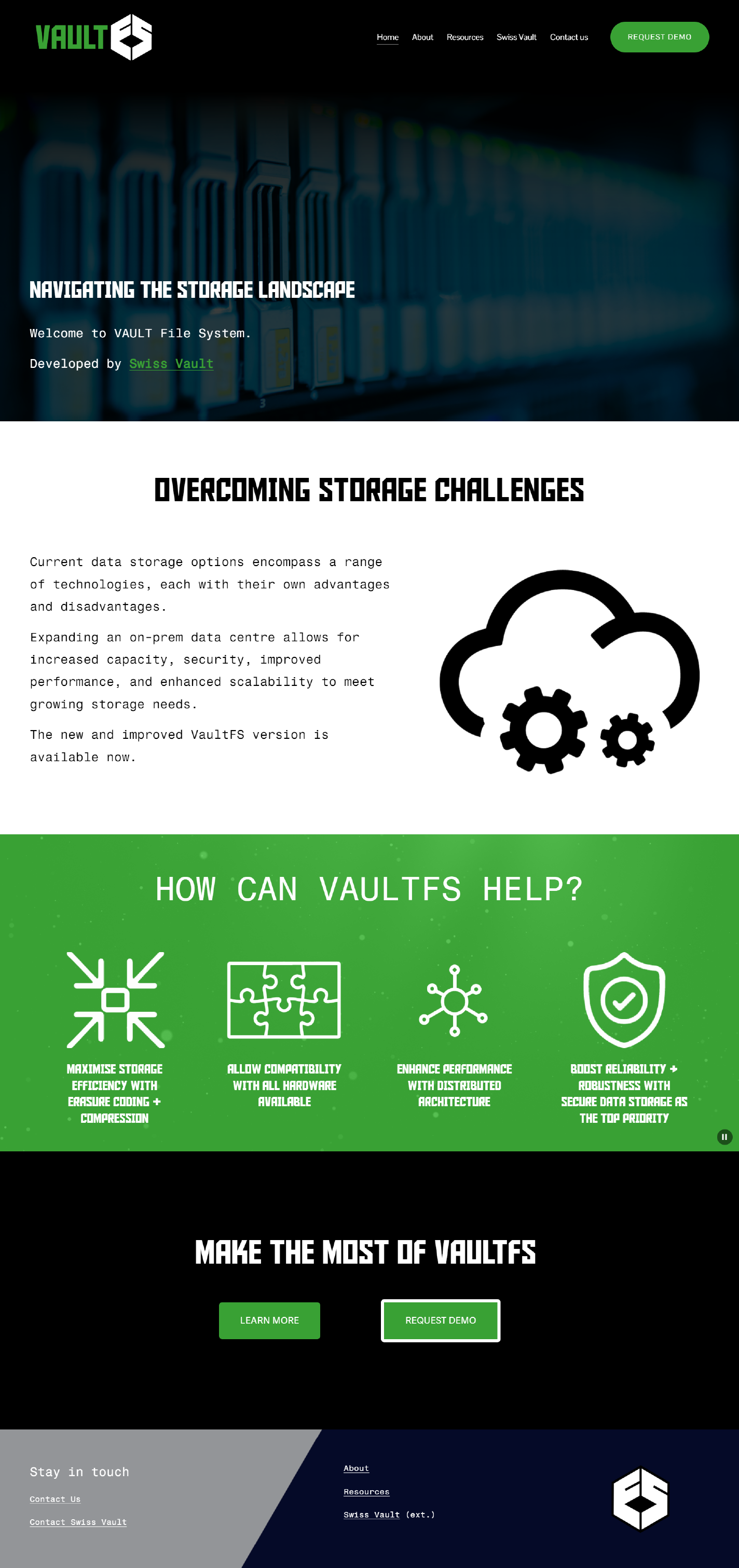 For this project, I was asked by long-term client Swiss Vault, to create a brand new website for their latest product: the Vault File System ("VaultFS" or VFS). VaultFS is a software-defined storage product which runs on any Linux or Unix system.